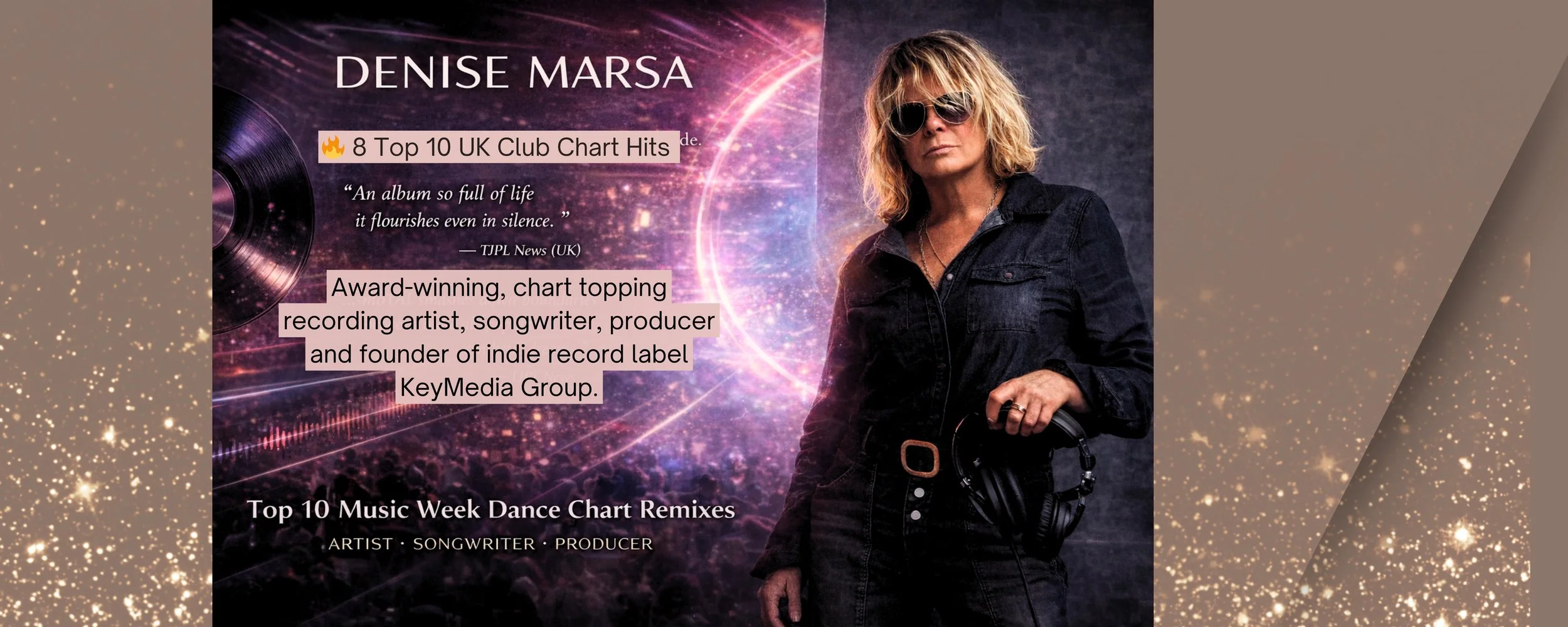 Denise Marsa is an award-winning singer-songwriter, producer, and founder of Marsa Media, a creative agency that also oversees KeyMedia Group, an independent record label, and KeyMedia Public Relations, its PR and marketing division. Known for bold, authentic artistry, Marsa’s music spans continents and genres, consistently connecting with audiences through emotion, craft, and storytelling.